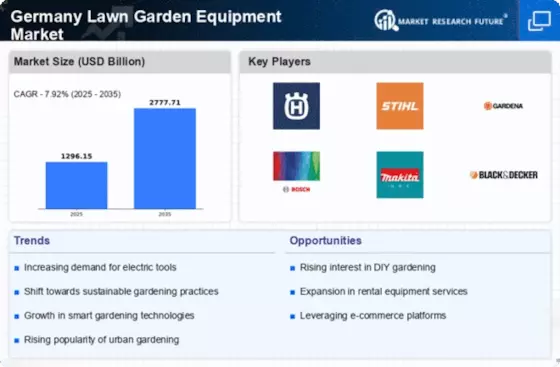 The Germany Lawn Garden Equipment Market exhibits a competitive landscape characterized by a blend of innovation, sustainability, and strategic partnerships. Key players such as Husqvarna (SE), Stihl (DE), and Gardena (DE) are at the forefront, each adopting distinct strategies to enhance their market presence. Husqvarna (SE) focuses on digital transformation, integrating smart technology into its product lines, while Stihl (DE) emphasizes sustainability through eco-friendly product development. Gardena (DE) leverages its strong brand recognition to expand its product offerings, particularly in smart irrigation solutions, thereby shaping a competitive environment that prioritizes technological advancement and environmental responsibility.