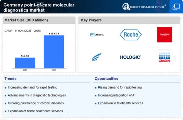 The increasing incidence of infectious diseases in Germany is a crucial driver for the point of-care-molecular-diagnostics market. With a growing population and urbanization, the demand for rapid and accurate diagnostic solutions is escalating. According to health statistics, the prevalence of diseases such as respiratory infections and sexually transmitted infections has risen, necessitating efficient diagnostic tools. The point of-care-molecular-diagnostics market is positioned to address these needs by providing timely results, which can significantly improve patient outcomes. Furthermore, the ability to conduct tests in various settings, including clinics and home care, enhances accessibility and convenience for patients. This trend indicates a robust growth trajectory for the market, as healthcare providers seek to implement advanced diagnostic technologies to manage and control infectious disease outbreaks effectively.