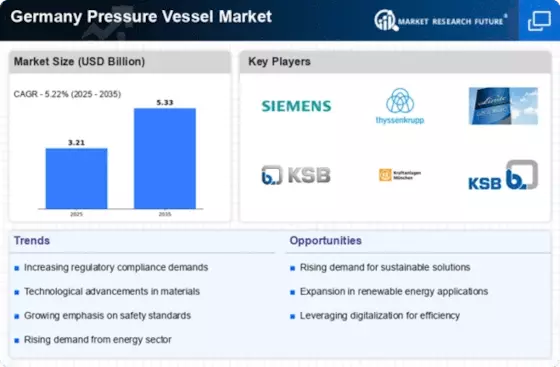 The Germany Pressure Vessel Market is significantly influenced by stringent regulatory compliance and safety standards. The German government enforces rigorous regulations, such as the Pressure Equipment Directive (PED), which mandates that all pressure vessels meet specific safety criteria. This regulatory framework compels manufacturers to invest in advanced technologies and materials to ensure compliance. As of 2025, approximately 70% of pressure vessel manufacturers in Germany have adopted enhanced safety measures to align with these regulations. This focus on safety not only protects end-users but also enhances the overall reputation of the industry, fostering consumer trust and driving market growth.