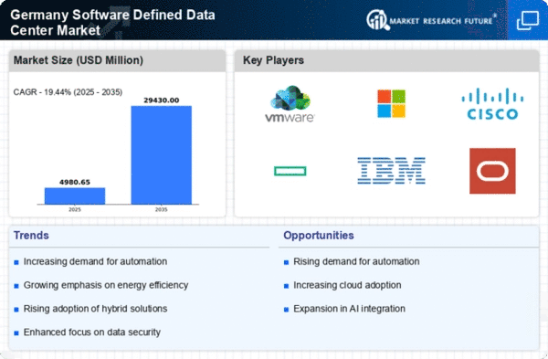 The software defined-data-center market is significantly influenced by the growing need for operational efficiency among organizations in Germany. Companies are increasingly recognizing the importance of optimizing their IT operations to reduce costs and enhance productivity. Software defined-data-centers enable automation and streamlined processes, which can lead to a reduction in operational expenses by as much as 20%. This efficiency is particularly appealing to businesses looking to maximize their return on investment in IT infrastructure. As organizations strive to remain competitive, the adoption of software defined-data-centers is likely to accelerate, driven by the desire to achieve greater agility and responsiveness in their operations. This trend reflects a broader shift towards more efficient and effective IT management practices.