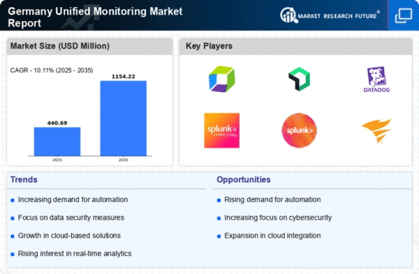 The unified monitoring market in Germany is characterized by a dynamic competitive landscape, driven by the increasing demand for real-time data analytics and performance monitoring solutions. Key players such as Dynatrace (US), New Relic (US), and Datadog (US) are at the forefront, leveraging innovative technologies and strategic partnerships to enhance their market presence. Dynatrace (US), for instance, focuses on AI-driven observability solutions, which positions it favorably in a market that increasingly values automation and predictive analytics. Meanwhile, New Relic (US) emphasizes its commitment to developer-centric tools, catering to the growing need for agile software development practices. Collectively, these strategies contribute to a competitive environment that is both collaborative and competitive, as companies seek to differentiate themselves through technological advancements and customer-centric solutions.