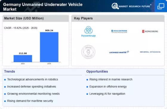 The Germany Unmanned Underwater Vehicle Market is witnessing rapid advancements in autonomous technologies, which are crucial for the development of next-generation UUVs. Innovations in artificial intelligence, machine learning, and sensor technologies are enabling UUVs to operate with greater autonomy and efficiency. These advancements are particularly relevant for applications in deep-sea exploration and complex underwater tasks. In 2025, it is estimated that the integration of autonomous technologies will account for approximately 30% of the UUV market in Germany, reflecting a shift towards more sophisticated and capable underwater systems. This trend suggests a promising future for the industry as it adapts to evolving technological landscapes.