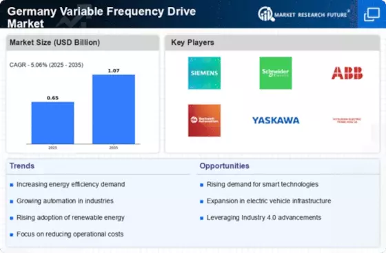The Germany Variable Frequency Drive Market is experiencing a notable shift towards renewable energy sources, driven by the country's commitment to sustainability and reducing carbon emissions. The German government has set ambitious targets for renewable energy, aiming for 65% of electricity consumption to come from renewable sources by 2030. This transition necessitates the integration of variable frequency drives (VFDs) in wind turbines and solar inverters, enhancing energy efficiency and grid stability. As a result, the demand for VFDs is expected to grow, with projections indicating a compound annual growth rate (CAGR) of approximately 6% in the coming years. This trend reflects a broader global movement towards cleaner energy solutions, positioning the Germany Variable Frequency Drive Market as a critical player in the renewable energy landscape.