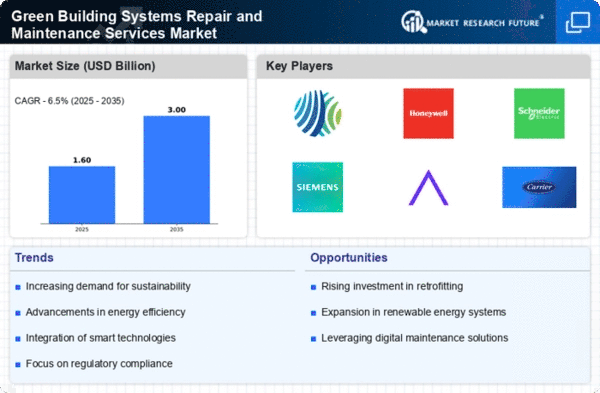 The Green Building Systems Repair and Maintenance Services Market is characterized by a dynamic competitive landscape, driven by increasing demand for sustainable building practices and energy efficiency. Key players such as Johnson Controls (US), Honeywell (US), and Schneider Electric (FR) are at the forefront, each adopting distinct strategies to enhance their market positioning. Johnson Controls (US) emphasizes innovation in smart building technologies, while Honeywell (US) focuses on integrating advanced analytics into its service offerings. Schneider Electric (FR) is actively pursuing partnerships to expand its digital solutions, collectively shaping a competitive environment that prioritizes technological advancement and sustainability.The market structure appears moderately fragmented, with a mix of established players and emerging companies. Key business tactics include localizing manufacturing to reduce costs and optimize supply chains, which is crucial in maintaining competitive pricing. The influence of major players is significant, as their strategic initiatives often set industry standards and drive overall market growth.