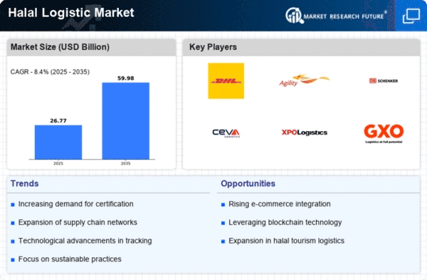 The Halal Logistic Market is currently characterized by a dynamic competitive landscape, driven by increasing consumer demand for Halal products and the necessity for compliance with stringent regulatory standards. Key players such as DHL (DE), Kuehne + Nagel (CH), and Agility (KW) are strategically positioning themselves through innovation and regional expansion. DHL (DE) has focused on enhancing its supply chain capabilities to cater to the growing Halal market, while Kuehne + Nagel (CH) emphasizes digital transformation to streamline operations. Agility (KW) is leveraging partnerships with local suppliers to ensure compliance and quality assurance, collectively shaping a competitive environment that prioritizes reliability and efficiency.In terms of business tactics, companies are increasingly localizing their operations to better serve regional markets, optimizing supply chains to reduce costs and improve service delivery. The market appears moderately fragmented, with several key players exerting influence through strategic initiatives. This structure allows for a diverse range of offerings, catering to various segments within the Halal logistics space.