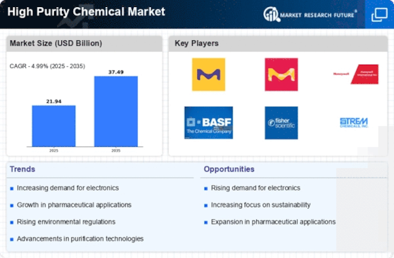 The High Purity Chemical Market is experiencing a notable surge in demand driven by the electronics sector. As technology advances, the need for high-purity chemicals in semiconductor manufacturing and electronic components becomes increasingly critical. For instance, the semiconductor industry is projected to grow at a compound annual growth rate (CAGR) of approximately 5.6% from 2025 to 2030. This growth is likely to propel the demand for high-purity chemicals, which are essential for producing high-performance electronic devices. Furthermore, the increasing miniaturization of electronic components necessitates the use of ultra-pure chemicals to ensure reliability and performance. Consequently, manufacturers in the High Purity Chemical Market are focusing on enhancing their production capabilities to meet this escalating demand.