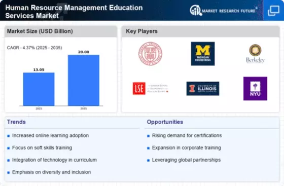 The Human Resource Management Education Services Market is characterized by a dynamic competitive landscape, driven by the increasing demand for skilled HR professionals and the evolving nature of work. Key players such as Cornell University (US), University of Michigan (US), and London School of Economics (GB) are strategically positioned to leverage their academic prowess and industry connections. These institutions focus on innovation in curriculum design, digital transformation of learning platforms, and partnerships with businesses to enhance employability outcomes for graduates. Their collective strategies not only foster a competitive environment but also contribute to the overall growth of the market by aligning educational offerings with industry needs.In terms of business tactics, institutions are increasingly localizing their programs to cater to regional workforce demands, optimizing their supply chains for educational resources, and enhancing their online learning capabilities. The market appears moderately fragmented, with a mix of established universities and emerging online education platforms. The influence of key players is substantial, as they set benchmarks for quality and relevance in HR education, thereby shaping the expectations of both students and employers.