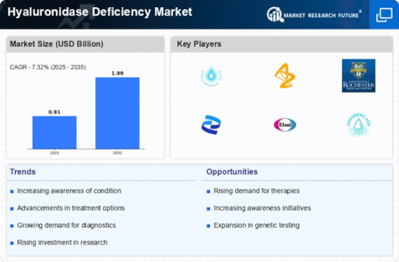 The increasing investment in research focused on rare diseases is a critical driver for the Hyaluronidase Deficiency Market. Pharmaceutical companies and research institutions are allocating more resources to understand the mechanisms of rare conditions, including hyaluronidase deficiency. This trend is likely to result in the development of novel therapies and treatment modalities tailored to the specific needs of affected individuals. Furthermore, government initiatives aimed at incentivizing research in rare diseases may enhance funding opportunities, fostering collaboration between academia and industry. As a result, the market could witness a surge in innovative treatment options, which may improve patient outcomes and quality of life. The emphasis on rare disease research is expected to create a more robust pipeline of therapies, ultimately benefiting the hyaluronidase deficiency patient community.