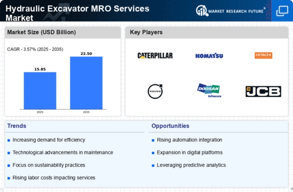 The Hydraulic Excavator MRO Services Market is characterized by a competitive landscape that is increasingly shaped by technological advancements and strategic partnerships. Key players such as Caterpillar Inc (US), Komatsu Ltd (JP), and Hitachi Construction Machinery Co Ltd (JP) are actively pursuing innovation and digital transformation to enhance their service offerings. Caterpillar Inc (US) has focused on integrating advanced telematics into its MRO services, which allows for predictive maintenance and improved operational efficiency. Meanwhile, Komatsu Ltd (JP) has been investing in AI-driven solutions to optimize equipment performance, thereby positioning itself as a leader in smart construction technologies. These strategies collectively foster a competitive environment that emphasizes technological prowess and customer-centric solutions.In terms of business tactics, companies are increasingly localizing manufacturing and optimizing supply chains to enhance responsiveness to market demands. The competitive structure of the Hydraulic Excavator MRO Services Market appears moderately fragmented, with several key players exerting influence over various regional markets. This fragmentation allows for niche players to thrive, while larger corporations leverage their scale to optimize service delivery and reduce costs.