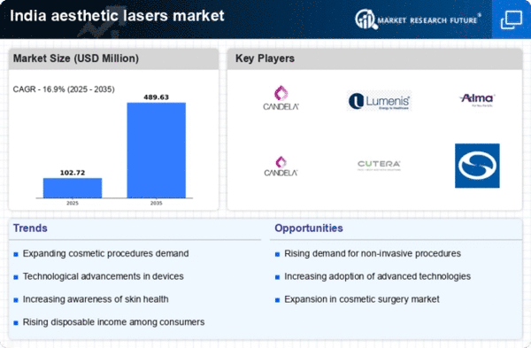 The aesthetic lasers market in India is experiencing a notable surge in demand for non-invasive cosmetic procedures. This trend is largely driven by a growing preference among consumers for treatments that offer minimal downtime and reduced recovery periods. As individuals become more conscious of their appearance, the appeal of non-invasive options, such as laser hair removal and skin rejuvenation, becomes increasingly pronounced. According to recent estimates, the market is projected to grow at a CAGR of approximately 15% over the next five years. This growth is indicative of a broader shift in consumer attitudes towards aesthetic treatments, where the focus is on achieving desired results without the need for surgical interventions. Consequently, the aesthetic lasers market is likely to expand significantly as more individuals seek out these innovative solutions.