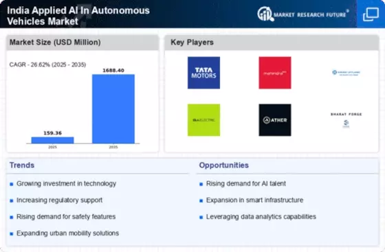 Rapid advancements in artificial intelligence technologies are significantly influencing the India Applied AI In Autonomous Vehicles Market. Innovations in machine learning, computer vision, and sensor technologies are enhancing the capabilities of autonomous vehicles, making them safer and more efficient. For instance, the integration of AI algorithms for real-time data processing allows vehicles to navigate complex urban environments effectively. According to recent estimates, the AI market in India is projected to reach USD 7.8 billion by 2025, indicating a robust growth trajectory. This growth is likely to bolster the development of AI applications in autonomous vehicles, thereby propelling the India Applied AI In Autonomous Vehicles Market forward. As companies invest in R&D to harness these technologies, the market is expected to witness a surge in innovative solutions that cater to the unique challenges of Indian road conditions.
