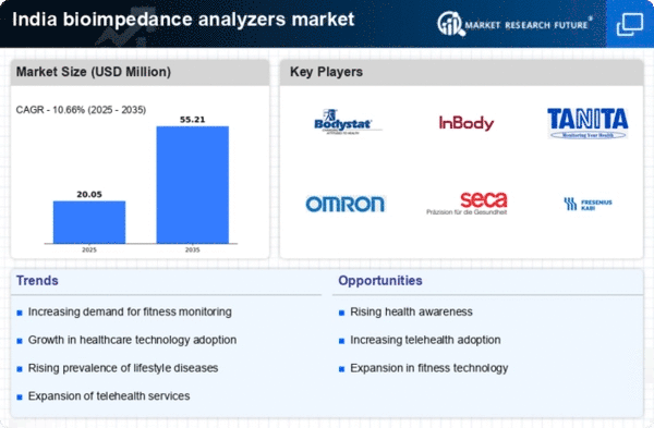 The The bioimpedance analyzers market in India is experiencing a notable surge in demand for non-invasive health monitoring solutions. As individuals increasingly seek convenient and accurate methods to assess their health metrics, bioimpedance technology offers a compelling alternative. This trend is particularly pronounced among fitness enthusiasts and individuals managing chronic conditions, who prefer devices that provide real-time data without the discomfort associated with invasive procedures. The market is projected to grow at a CAGR of approximately 10% over the next five years, driven by this rising demand. Furthermore, the increasing prevalence of lifestyle-related diseases in India necessitates regular health assessments, further propelling the adoption of bioimpedance analyzers. Consequently, the market is likely to expand as more consumers recognize the benefits of these devices for personal health management.