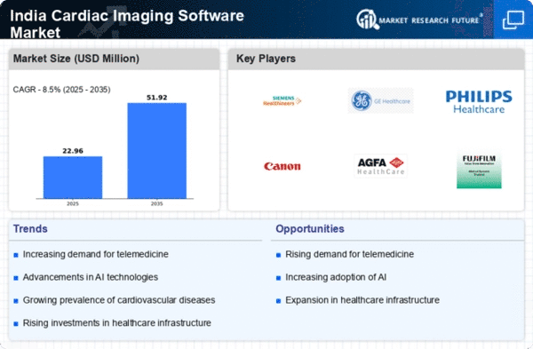 The increasing prevalence of cardiovascular diseases in India is a primary driver for the cardiac imaging-software market. According to recent health statistics, cardiovascular diseases account for approximately 28% of all deaths in the country. This alarming trend necessitates advanced diagnostic tools, including cardiac imaging software, to enhance early detection and treatment. As healthcare providers strive to improve patient outcomes, the demand for sophisticated imaging solutions is likely to rise. The cardiac imaging-software market is expected to witness substantial growth as hospitals and clinics invest in technology that can provide accurate and timely diagnoses. Furthermore, the integration of these software solutions into routine clinical practice is anticipated to become more prevalent, thereby driving market expansion.