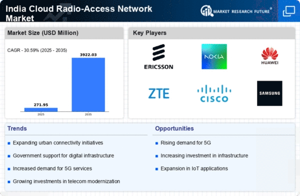 The The market in India is experiencing a surge in demand for high-speed connectivity. in India is experiencing a surge in demand for high-speed connectivity. With the increasing reliance on digital services, consumers and businesses alike are seeking faster and more reliable internet access. This demand is driven by the proliferation of smart devices and the growing trend of remote work. According to recent data, the number of internet users in India has surpassed 800 million, indicating a robust market potential. As a result, telecom operators are investing heavily in cloud radio-access-network solutions to enhance their service offerings. This trend is likely to continue, as the need for seamless connectivity becomes paramount in various sectors, including education, healthcare, and entertainment. The cloud radio-access-network market is thus positioned to benefit significantly from this rising demand for high-speed connectivity.