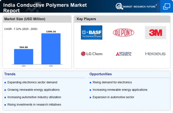 The conductive polymers market in India is characterized by a dynamic competitive landscape, driven by increasing demand across various sectors such as electronics, automotive, and healthcare. Key players are actively engaging in strategies that emphasize innovation, regional expansion, and sustainability. Companies like BASF SE (Germany) and DuPont (US) are focusing on enhancing their product portfolios through research and development, while 3M Company (US) is leveraging its extensive distribution network to penetrate deeper into the Indian market. This collective approach not only fosters competition but also encourages advancements in product offerings, thereby shaping the overall market environment.In terms of business tactics, companies are increasingly localizing manufacturing to reduce costs and improve supply chain efficiency. The market structure appears moderately fragmented, with several players vying for market share. However, the influence of major companies is substantial, as they set benchmarks for quality and innovation. This competitive structure allows for a diverse range of products, catering to the specific needs of various industries, while also fostering a culture of continuous improvement among smaller players.