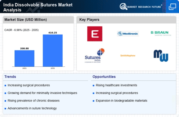 Advancements in suture technology are significantly influencing the dissolvable sutures market. Innovations in biocompatible materials and manufacturing processes have led to the development of sutures that offer enhanced performance characteristics, such as improved tensile strength and controlled degradation rates. In India, research and development efforts are increasingly focused on creating sutures that cater to specific surgical needs, which may lead to a broader acceptance of dissolvable sutures among surgeons. The market is projected to grow as these innovations become more widely adopted in clinical settings. Furthermore, the introduction of new materials that promote faster healing and reduce the risk of infection could further bolster the dissolvable sutures market, as healthcare providers seek to improve patient outcomes.