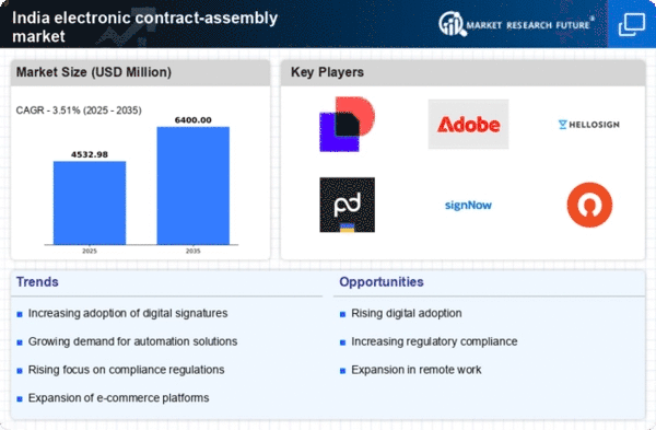 Cost efficiency remains a critical driver for the electronic contract-assembly market in India. Businesses are continually seeking ways to optimize resources and reduce operational costs. The implementation of electronic contract assembly solutions can lead to substantial savings by minimizing paper usage and reducing the time spent on manual processes. Reports indicate that organizations can save up to 25% in operational costs by adopting automated contract management systems. This financial incentive is likely to encourage more companies to invest in electronic contract solutions, thereby fostering growth in the electronic contract-assembly market.