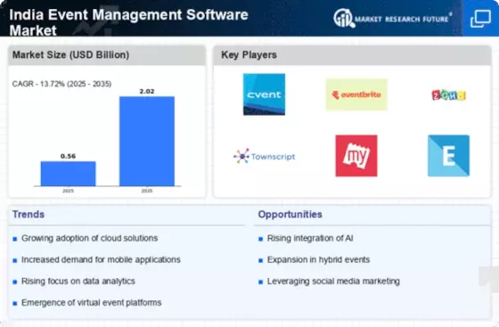 The India Event Management Software Market is significantly influenced by rapid technological advancements. Innovations such as artificial intelligence, machine learning, and mobile applications are transforming the way events are planned and executed. These technologies enable event organizers to automate processes, analyze attendee data, and enhance the overall event experience. For instance, AI-driven analytics can provide insights into attendee preferences, allowing for more personalized experiences. The integration of mobile applications facilitates real-time communication and engagement during events. As technology continues to evolve, event management software that incorporates these advancements is likely to gain traction in the market. This trend suggests a promising future for the India Event Management Software Market, as organizations increasingly seek to leverage technology to optimize their event management processes.