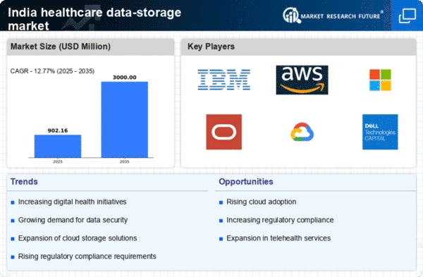 The healthcare data-storage market in India experiences a notable surge in demand for digital health solutions. As healthcare providers increasingly adopt electronic health records (EHRs) and telemedicine platforms, the need for efficient data storage solutions becomes paramount. According to recent estimates, the digital health market in India is projected to reach approximately $10 billion by 2025, indicating a robust growth trajectory. This trend necessitates scalable and secure data storage systems to accommodate the influx of patient data. Consequently, healthcare organizations are investing in advanced storage technologies to ensure seamless access to patient information, thereby enhancing the quality of care. The rising demand for digital health solutions is a critical driver for the healthcare data-storage market, as it compels stakeholders to prioritize data management and storage capabilities.