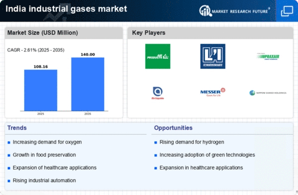 The industrial gases market in India is characterized by a competitive landscape that is increasingly shaped by innovation, sustainability, and strategic partnerships. Key players such as Air Products (US), Linde (DE), and Air Liquide (FR) are actively pursuing growth through technological advancements and regional expansions. Air Products (US) has focused on enhancing its production capabilities, particularly in hydrogen and specialty gases, which are critical for various industrial applications. Linde (DE) emphasizes its commitment to sustainability, investing in green hydrogen projects that align with global decarbonization goals. Meanwhile, Air Liquide (FR) is leveraging digital transformation to optimize its operations and improve customer engagement, thereby enhancing its competitive positioning.
