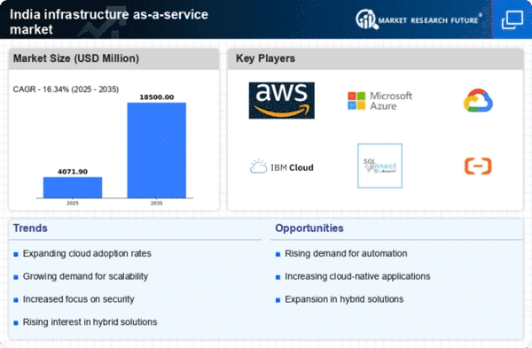 The increasing adoption of cloud technologies in India is a primary driver for the infrastructure as-a-service market. Organizations are transitioning from traditional IT setups to cloud-based solutions to enhance operational efficiency and reduce costs. According to recent data, the cloud computing market in India is projected to reach $10 billion by 2025, indicating a robust growth trajectory. This shift is largely attributed to the need for scalable resources and the flexibility that cloud services offer. As businesses seek to optimize their IT infrastructure, This trend is likely to benefit significantly. Furthermore, the rise of remote work and digital transformation initiatives across various sectors is propelling the demand for cloud-based services, thereby reinforcing the infrastructure as-a-service market's position in the Indian economy.