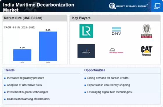 The India Maritime Decarbonization Market is experiencing a transformative phase due to the implementation of stringent regulatory frameworks. The Indian government has introduced policies aimed at reducing greenhouse gas emissions from maritime activities, aligning with global standards set by the International Maritime Organization. For instance, the introduction of the Energy Efficiency Existing Ship Index (EEXI) and the Carbon Intensity Indicator (CII) is expected to drive compliance among shipowners and operators. These regulations not only promote energy efficiency but also encourage investments in cleaner technologies. As a result, the market is likely to witness a surge in demand for retrofitting existing vessels and adopting new builds that meet these standards. The regulatory landscape thus serves as a catalyst for innovation and investment in the India Maritime Decarbonization Market.