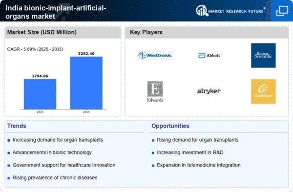 The increasing awareness and acceptance of bionic solutions among the Indian population is a significant driver for the medical bionic-implant-artificial-organs market. Educational campaigns and success stories of patients benefiting from bionic implants are contributing to a shift in public perception. As more individuals become informed about the potential of these technologies, the demand for bionic implants is likely to rise. Surveys indicate that approximately 60% of the population is now open to considering bionic solutions for organ replacement, reflecting a growing trust in these advanced medical interventions. This trend suggests that the medical bionic-implant-artificial-organs market may experience accelerated growth as societal acceptance continues to evolve.