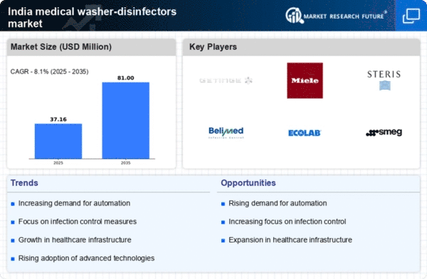 The medical washer-disinfectors market in India is characterized by a competitive landscape that is increasingly shaped by innovation, strategic partnerships, and a focus on sustainability. Key players such as Getinge (SE), Steris (US), and Ecolab (US) are actively enhancing their market positions through technological advancements and regional expansions. Getinge (SE), for instance, emphasizes its commitment to innovation, particularly in developing energy-efficient and environmentally friendly washer-disinfectors, which aligns with the growing demand for sustainable healthcare solutions. Meanwhile, Steris (US) focuses on expanding its product portfolio and enhancing service offerings, thereby strengthening its competitive edge in the market. Collectively, these strategies indicate a shift towards a more integrated and technologically advanced competitive environment.