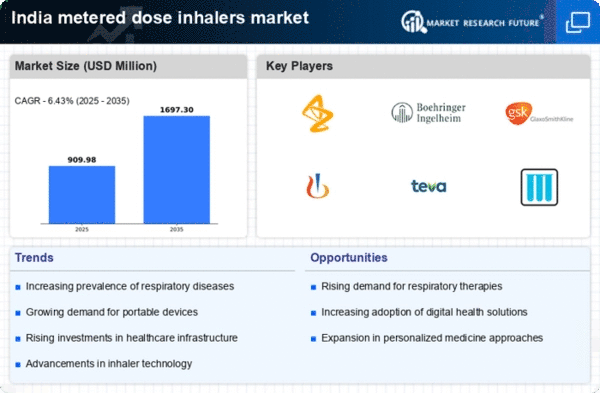 The rise in respiratory diseases in India is a primary driver for the metered dose-inhalers market. Conditions such as asthma and chronic obstructive pulmonary disease (COPD) are becoming increasingly prevalent, affecting millions. According to recent health statistics, approximately 15-20% of the Indian population suffers from asthma, which necessitates effective management solutions. The metered dose-inhalers market is likely to benefit from this growing patient base, as these devices are essential for delivering medication directly to the lungs. Furthermore, the increasing pollution levels in urban areas contribute to respiratory issues, further propelling the demand for inhalers. As healthcare providers emphasize the importance of proper medication adherence, the metered dose-inhalers market is expected to expand significantly in response to these health challenges.