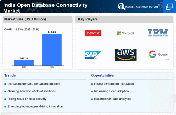 The open database-connectivity market is significantly influenced by the growing emphasis on data analytics across various industries in India. Organizations are increasingly recognizing the value of data-driven insights for strategic decision-making. As a result, there is a heightened demand for tools and solutions that enable efficient data retrieval and analysis. The analytics market in India is expected to grow at a CAGR of 25% from 2023 to 2025, reflecting the urgency for businesses to harness data effectively. Open database-connectivity solutions play a crucial role in this landscape by providing the necessary infrastructure for real-time data access and integration, thereby empowering organizations to derive actionable insights and enhance their competitive edge.