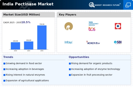 The rising trend towards organic and natural products is becoming a significant driver for the india pectinase market. As consumers increasingly seek out organic food options, the demand for natural enzymes like pectinase is likely to grow. Pectinase is essential in the production of organic fruit juices and jams, where it aids in the extraction and clarification processes without the use of synthetic additives. Market analysis indicates that the organic food market in India is projected to reach USD 1 billion by 2025, reflecting a growing consumer preference for organic products. This trend is expected to encourage food manufacturers to adopt pectinase in their production processes, thereby enhancing the overall growth of the india pectinase market.