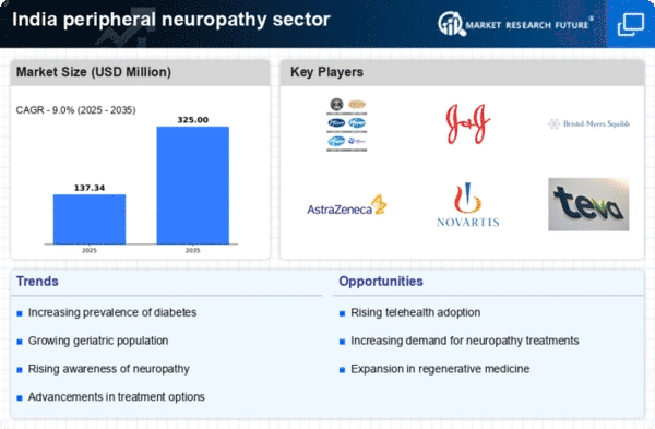 Government initiatives aimed at improving healthcare access and quality are likely to drive the peripheral neuropathy market in India. Policies that promote early diagnosis and treatment of chronic diseases, including diabetes, are essential in addressing the growing burden of neuropathy. The Indian government has been implementing various health programs to enhance awareness and provide better healthcare services. For instance, the National Health Mission focuses on strengthening healthcare infrastructure, which may facilitate improved access to neuropathy treatments. Additionally, financial support for research and development in the healthcare sector could lead to innovative therapies entering the market. These initiatives indicate a supportive environment for the growth of the peripheral neuropathy market, as they aim to reduce the incidence and impact of neuropathic conditions.