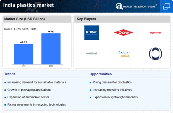 The plastics market in India is characterized by a dynamic competitive landscape, driven by increasing demand across various sectors such as packaging, automotive, and construction. Key players are actively pursuing strategies that emphasize innovation, sustainability, and regional expansion. For instance, BASF (DE) has been focusing on developing advanced materials that cater to the growing demand for lightweight and durable products, while Dow (US) is enhancing its operational capabilities through digital transformation initiatives aimed at optimizing production efficiency. These strategies collectively contribute to a competitive environment that is increasingly shaped by technological advancements and sustainability goals.In terms of business tactics, companies are localizing manufacturing to reduce costs and improve supply chain resilience. The market structure appears moderately fragmented, with several key players exerting influence over their respective segments. This fragmentation allows for a diverse range of products and innovations, although it also intensifies competition among established and emerging firms.