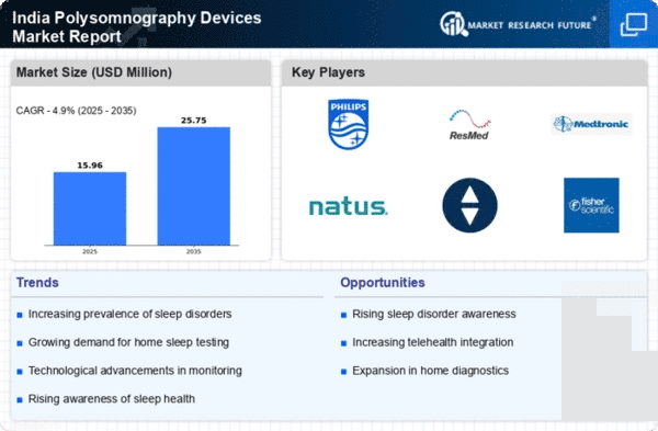 Technological advancements in sleep monitoring are significantly influencing the polysomnography devices market. Innovations such as portable sleep monitors, advanced sensors, and artificial intelligence algorithms are enhancing the accuracy and efficiency of sleep studies. These developments allow for more comprehensive data collection and analysis, which is crucial for diagnosing sleep disorders. The introduction of user-friendly devices that can be used at home is also expanding access to sleep diagnostics. As a result, the market is likely to experience increased adoption rates among both healthcare providers and patients. Furthermore, the integration of telemedicine with polysomnography devices is facilitating remote monitoring, which is particularly beneficial in rural areas of India where access to healthcare facilities may be limited. This trend suggests a promising future for the polysomnography devices market as technology continues to evolve.