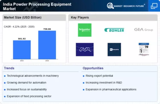 Technological innovations play a pivotal role in shaping the India Powder Processing Equipment Market. The advent of automation and smart processing technologies is revolutionizing the way powder processing is conducted. Equipment that incorporates IoT and AI capabilities allows for real-time monitoring and optimization of processing parameters, leading to improved efficiency and reduced waste. As manufacturers strive to enhance productivity and maintain quality standards, the integration of such advanced technologies is becoming increasingly essential. This trend not only boosts operational efficiency but also aligns with the growing emphasis on sustainability in the industry.