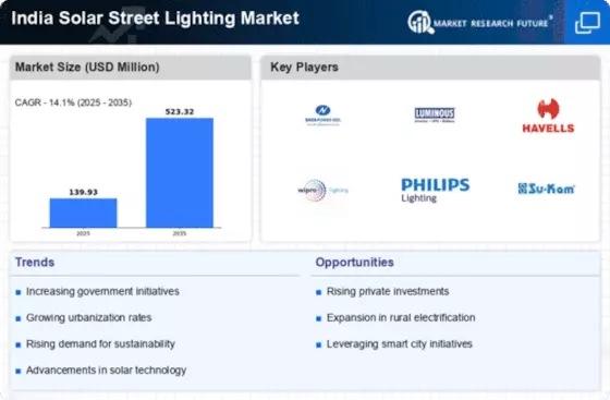 Technological advancements play a pivotal role in shaping the India Solar Street Lighting Market. Innovations in solar panel efficiency, battery storage, and smart lighting technologies are enhancing the performance and reliability of solar street lights. For instance, the integration of LED technology has significantly improved energy efficiency, allowing for longer operational hours with reduced energy consumption. Additionally, the advent of IoT-enabled solar street lights facilitates remote monitoring and management, optimizing energy use and maintenance. As of early 2026, the market is witnessing a shift towards more intelligent systems that can adapt to environmental conditions, thereby maximizing energy savings. These technological improvements not only enhance the functionality of solar street lights but also contribute to lowering overall costs, making them more attractive to municipalities and private entities within the India Solar Street Lighting Market.