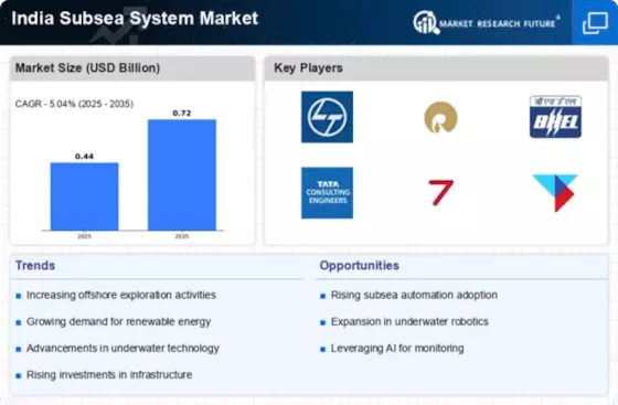 The India Subsea System Market is experiencing a notable transformation driven by rapid technological advancements. Innovations in underwater robotics, sensors, and data analytics are enhancing the efficiency and safety of subsea operations. For instance, the integration of autonomous underwater vehicles (AUVs) is revolutionizing exploration and monitoring activities, allowing for real-time data collection and analysis. According to recent estimates, the market for subsea technologies in India is projected to grow at a compound annual growth rate (CAGR) of approximately 8% over the next five years. This growth is indicative of the increasing reliance on advanced technologies to optimize subsea operations, reduce costs, and improve overall project outcomes. As companies invest in research and development, the potential for new applications and solutions within the India Subsea System Market appears promising.