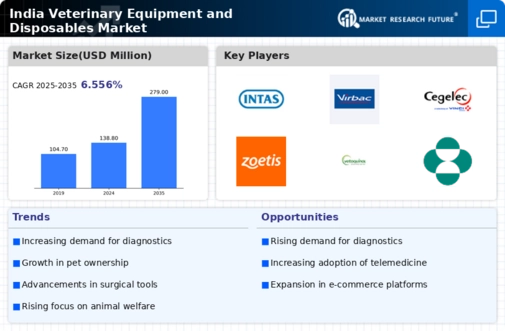 Technological advancements in veterinary care are transforming the landscape of the india veterinary equipment disposables market. Innovations such as telemedicine and advanced diagnostic tools are becoming more prevalent, leading to a higher demand for disposable equipment that complements these technologies. For instance, the integration of digital health records in veterinary practices necessitates the use of disposable items to maintain hygiene standards. Additionally, the development of new materials and designs for disposable products enhances their functionality and effectiveness. As veterinary practices adopt these technologies, the india veterinary equipment disposables market is likely to experience growth driven by the need for modern, efficient, and safe veterinary care solutions.