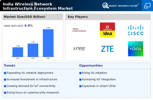 The increasing demand for high-speed connectivity in The India Wireless Network Infrastructure Ecosystem Market appears to be a primary driver. With the proliferation of digital services and online platforms, consumers and businesses alike are seeking faster and more reliable internet access. According to recent data, the number of internet users in India has surpassed 800 million, indicating a substantial market for enhanced wireless infrastructure. This surge in demand necessitates the expansion and upgrading of existing network infrastructure, thereby propelling investments in the sector. As a result, telecom operators are likely to prioritize the deployment of advanced technologies, such as 5G, to meet consumer expectations and remain competitive in the evolving landscape.