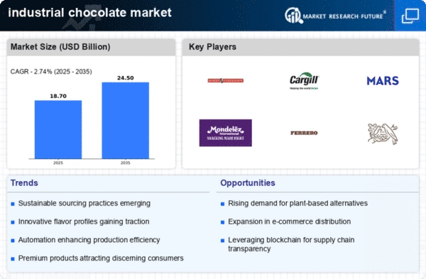 The Asia-Pacific industrial chocolate market, valued at $2.5 billion, is witnessing rapid growth driven by increasing urbanization and changing consumer preferences. The rise in disposable incomes and a growing middle class are contributing to higher demand for chocolate products. Regulatory initiatives aimed at improving food safety and quality standards are also enhancing market conditions, fostering consumer trust. Countries like China and India are leading the charge in this region, with a burgeoning market for both premium and mass-market chocolate products. Key players such as Olam International and Mars are expanding their presence, focusing on local tastes and preferences. The competitive landscape is evolving, with both multinational corporations and local brands vying for market share, indicating a promising future for the industry.