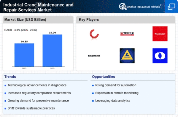 The Industrial Crane Maintenance and Repair Services Market is characterized by a competitive landscape that is increasingly shaped by technological advancements and strategic partnerships. Key growth drivers include the rising demand for efficient and safe lifting solutions across various industries, such as construction, manufacturing, and logistics. Major players like Konecranes (FI), Terex Corporation (US), and Mammoet (NL) are strategically positioning themselves through innovation and regional expansion. For instance, Konecranes (FI) has focused on digital transformation initiatives, enhancing its service offerings through advanced data analytics and IoT solutions, which collectively shape a competitive environment that emphasizes efficiency and reliability.In terms of business tactics, companies are increasingly localizing manufacturing and optimizing supply chains to enhance service delivery and reduce operational costs. The market structure appears moderately fragmented, with several key players exerting influence over their respective regions. This fragmentation allows for a diverse range of service offerings, yet the collective strength of major players like Liebherr (DE) and United Rentals (US) suggests a competitive dynamic that is both collaborative and competitive, as these companies seek to leverage their strengths in technology and service capabilities.