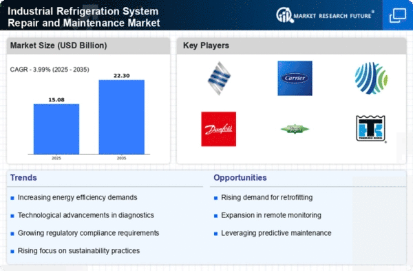 The Industrial Refrigeration System Repair and Maintenance Market is characterized by a competitive landscape that is increasingly shaped by innovation, sustainability, and digital transformation. Key players such as Emerson (US), Carrier (US), and Johnson Controls (US) are actively pursuing strategies that enhance their operational capabilities and market presence. Emerson (US) focuses on integrating advanced technologies into its service offerings, which not only improves efficiency but also aligns with the growing demand for sustainable solutions. Carrier (US) emphasizes regional expansion and strategic partnerships, particularly in emerging markets, to bolster its service network and customer reach. Meanwhile, Johnson Controls (US) is investing in digital solutions that enhance predictive maintenance capabilities, thereby reducing downtime for clients and optimizing operational performance. Collectively, these strategies indicate a shift towards a more integrated and technologically advanced competitive environment.In terms of business tactics, companies are increasingly localizing manufacturing and optimizing supply chains to enhance responsiveness to market demands. The market structure appears moderately fragmented, with several key players exerting significant influence. This fragmentation allows for a diverse range of service offerings, yet the collective strength of major companies like Emerson (US) and Carrier (US) suggests a competitive dynamic that favors those who can leverage technology and innovation effectively.