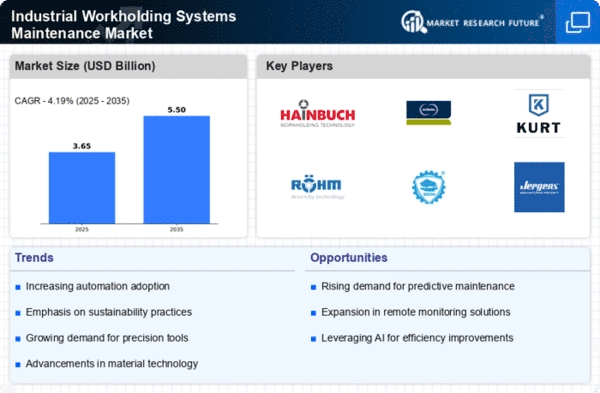 The Industrial Workholding Systems Maintenance Market is characterized by a competitive landscape that is increasingly shaped by innovation, technological advancements, and strategic partnerships. Key players such as Hainbuch GmbH (DE), Schunk GmbH & Co. KG (DE), and Kurt Manufacturing Company (US) are actively pursuing strategies that enhance their market positioning. Hainbuch GmbH (DE) focuses on precision engineering and has recently invested in R&D to develop advanced clamping solutions that cater to the evolving needs of the manufacturing sector. Schunk GmbH & Co. KG (DE) emphasizes digital transformation, integrating smart technologies into their workholding systems, which enhances operational efficiency and customer engagement. Kurt Manufacturing Company (US) is leveraging its strong brand reputation to expand its product offerings, particularly in the aerospace and automotive sectors, thereby solidifying its competitive edge.The business tactics employed by these companies reflect a concerted effort to optimize supply chains and localize manufacturing processes. The market appears moderately fragmented, with a mix of established players and emerging companies vying for market share. The collective influence of these key players is significant, as they drive innovation and set industry standards, which in turn shapes the competitive dynamics of the market.