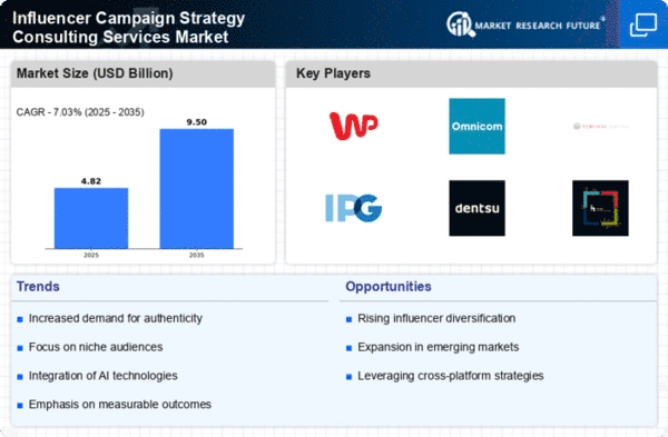 The Influencer Campaign Strategy Consulting Services Market is characterized by a dynamic competitive landscape, driven by the increasing demand for personalized marketing strategies and the growing influence of social media platforms. Major players such as WPP (GB), Omnicom Group (US), and Publicis Groupe (FR) are at the forefront, leveraging their extensive networks and expertise to shape market trends. WPP (GB) has focused on integrating advanced analytics into its influencer strategies, enhancing client campaigns through data-driven insights. Meanwhile, Omnicom Group (US) has emphasized strategic partnerships with emerging social media platforms, allowing for innovative campaign executions that resonate with younger demographics. Publicis Groupe (FR) appears to be concentrating on sustainability in influencer marketing, aligning its strategies with broader corporate social responsibility goals, which may enhance brand loyalty among eco-conscious consumers.The market structure is moderately fragmented, with numerous players vying for market share. Key business tactics include localizing campaigns to cater to regional audiences and optimizing supply chains to ensure timely delivery of influencer content. The collective influence of these major players fosters a competitive environment where agility and responsiveness to market trends are paramount. As companies adapt to the evolving landscape, their ability to innovate and differentiate their offerings becomes increasingly critical.