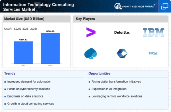 The Information Technology Consulting Services Market is characterized by a dynamic competitive landscape, driven by rapid technological advancements and an increasing demand for digital transformation across various sectors. Major players such as Accenture (IE), Deloitte (GB), and IBM (US) are strategically positioned to leverage their extensive expertise in consulting and technology integration. Accenture (IE) focuses on innovation and digital solutions, emphasizing cloud services and AI capabilities, while Deloitte (GB) has been enhancing its consulting services through strategic acquisitions and partnerships, particularly in cybersecurity and data analytics. IBM (US), on the other hand, is concentrating on integrating AI and quantum computing into its consulting offerings, thereby reshaping its operational focus to meet evolving client needs. Collectively, these strategies contribute to a competitive environment that is increasingly centered around technological innovation and client-centric solutions.The market's competitive structure appears moderately fragmented, with a mix of large multinational corporations and smaller niche players. Key business tactics such as localizing services and optimizing supply chains are prevalent among these firms, allowing them to respond swiftly to regional demands and enhance service delivery. The influence of major players is significant, as their strategic initiatives often set industry benchmarks and drive overall market growth.