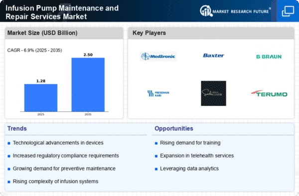 The Infusion Pump Maintenance and Repair Services Market is characterized by a competitive landscape that is increasingly shaped by innovation, strategic partnerships, and a focus on operational efficiency. Key players such as Medtronic (US), Baxter International (US), and B. Braun Melsungen AG (DE) are actively pursuing strategies that enhance their market positioning. Medtronic (US) emphasizes technological advancements in infusion systems, while Baxter International (US) focuses on expanding its service offerings through strategic acquisitions. B. Braun Melsungen AG (DE) appears to prioritize sustainability and digital transformation, which collectively influence the competitive dynamics of the market.The market structure is moderately fragmented, with several players vying for market share. Key business tactics include localizing manufacturing to reduce costs and optimize supply chains, which is essential in maintaining competitive pricing and service delivery. The collective influence of these major companies shapes the market, as they leverage their strengths to address customer needs and enhance service capabilities.