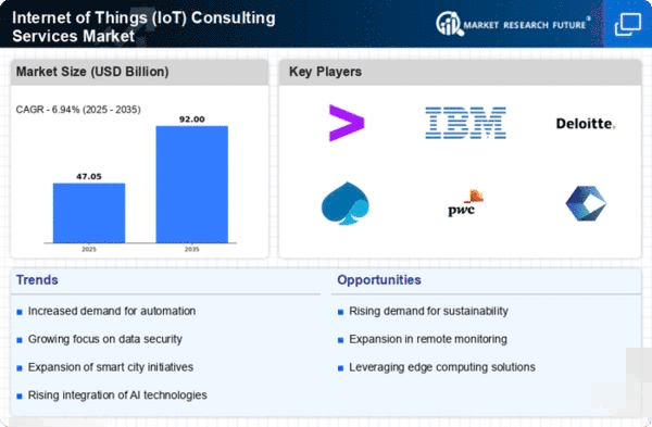 The proliferation of smart devices is a primary driver for the Internet of Things (IoT) Consulting Services Market. As consumers and businesses increasingly adopt smart technologies, the need for expert consulting services to integrate and optimize these devices becomes paramount. In 2025, it is estimated that the number of connected devices will surpass 30 billion, creating a substantial market for IoT consulting. This surge in device adoption necessitates specialized knowledge to ensure seamless connectivity and functionality, thereby driving demand for consulting services. Companies are seeking guidance on how to effectively implement IoT solutions to enhance operational efficiency and customer engagement. Consequently, the IoT consulting sector is poised for significant growth as organizations strive to navigate the complexities of smart device integration.