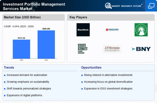 The Investment Portfolio Management Services Market is characterized by a dynamic competitive landscape, driven by factors such as technological advancements, increasing demand for personalized investment solutions, and a growing emphasis on sustainability. Major players like BlackRock (US), Vanguard Group (US), and Fidelity Investments (US) are at the forefront, each adopting distinct strategies to enhance their market positioning. BlackRock (US) focuses on integrating advanced analytics and AI into its investment processes, thereby improving decision-making and client engagement. Vanguard Group (US) emphasizes low-cost investment options and has been expanding its offerings in sustainable investment products, reflecting a broader market trend towards ESG (Environmental, Social, and Governance) criteria. Fidelity Investments (US) is actively pursuing digital transformation initiatives, enhancing its platform capabilities to attract tech-savvy investors, which collectively shapes a competitive environment that prioritizes innovation and client-centric solutions.The market structure appears moderately fragmented, with a mix of large institutional players and smaller niche firms. Key business tactics include localizing services to meet regional demands and optimizing supply chains to enhance operational efficiency. The collective influence of these major players fosters a competitive atmosphere where agility and responsiveness to market changes are paramount. As firms strive to differentiate themselves, the focus on personalized services and technological integration becomes increasingly pronounced.