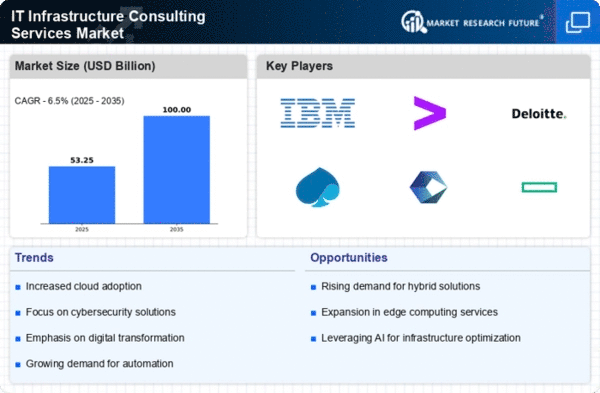 The IT Infrastructure Consulting Services Market is currently characterized by a dynamic competitive landscape, driven by rapid technological advancements and an increasing demand for digital transformation across various sectors. Major players such as IBM (US), Accenture (IE), and Deloitte (US) are strategically positioned to leverage their extensive expertise in cloud computing, cybersecurity, and data analytics. These companies are not only focusing on innovation but are also engaging in strategic partnerships and acquisitions to enhance their service offerings and expand their market reach. This collective approach appears to foster a competitive environment that emphasizes agility and responsiveness to client needs.In terms of business tactics, key players are increasingly localizing their operations to better serve regional markets, optimizing supply chains to enhance efficiency, and investing in advanced technologies. The market structure is moderately fragmented, with a mix of large multinational corporations and smaller niche players. This fragmentation allows for diverse service offerings, yet the influence of major companies remains substantial, as they set industry standards and drive technological advancements.