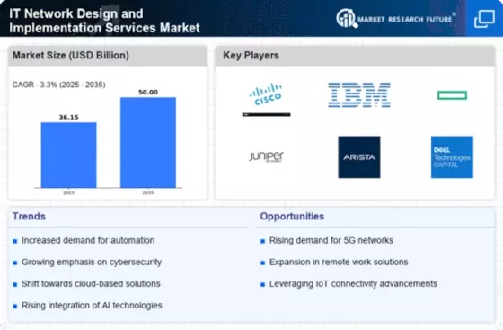 The IT Network Design and Implementation Services Market is characterized by a dynamic competitive landscape, driven by rapid technological advancements and increasing demand for robust network infrastructures. Key players such as Cisco Systems (US), IBM (US), and Huawei Technologies (CN) are at the forefront, each adopting distinct strategies to enhance their market positioning. Cisco Systems (US) emphasizes innovation through its extensive portfolio of networking solutions, while IBM (US) focuses on integrating AI and cloud capabilities into its offerings. Huawei Technologies (CN) leverages its global reach and competitive pricing to penetrate emerging markets, thereby shaping the competitive environment through a blend of technological prowess and strategic pricing.The market structure appears moderately fragmented, with a mix of established players and emerging companies vying for market share. Key business tactics include localizing manufacturing to reduce costs and optimize supply chains, which is particularly relevant in the context of geopolitical tensions and trade regulations. The collective influence of these major players fosters a competitive atmosphere where innovation and operational efficiency are paramount.